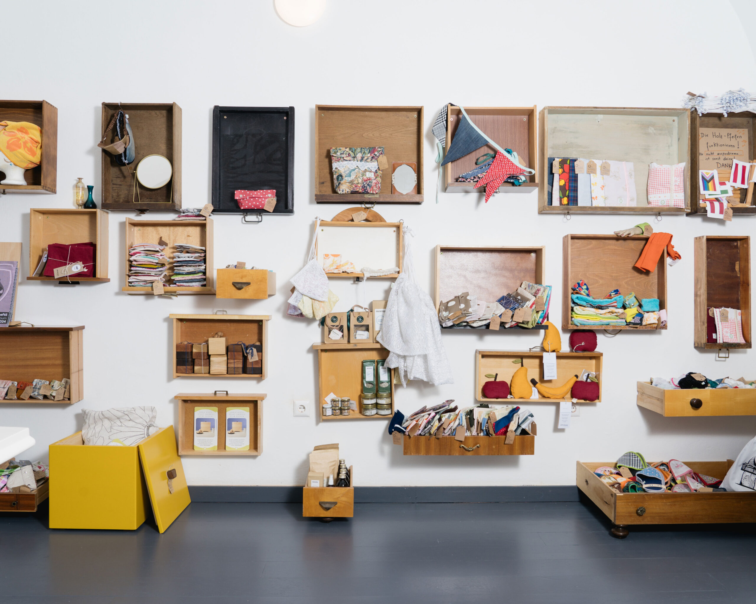Die Teilnehmer*innen des Projekts Offline produzieren in Nähwerkstätten und einer Möbelwerkstatt Produkte aus Textilien, Holz, Keramik und Glas. Jedes Stück ist ein Unikat, in liebevoller Handarbeit gefertigt oder wiederaufbereitet.